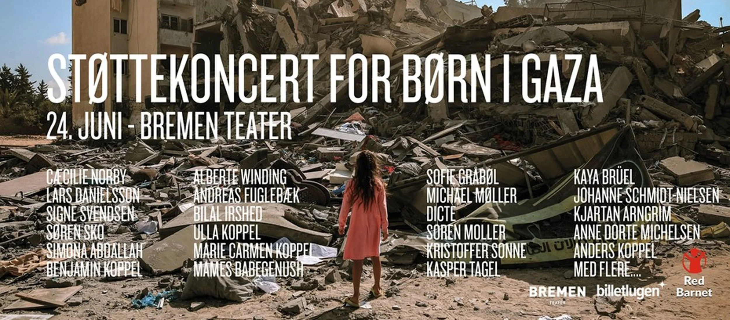 Red Barnet og Benjamin Koppel samlede en perlerække af sangere, skuespillere og musikere til en støttekoncert for Gazas børn på Bremen Teater i København 24. juni 2025.
