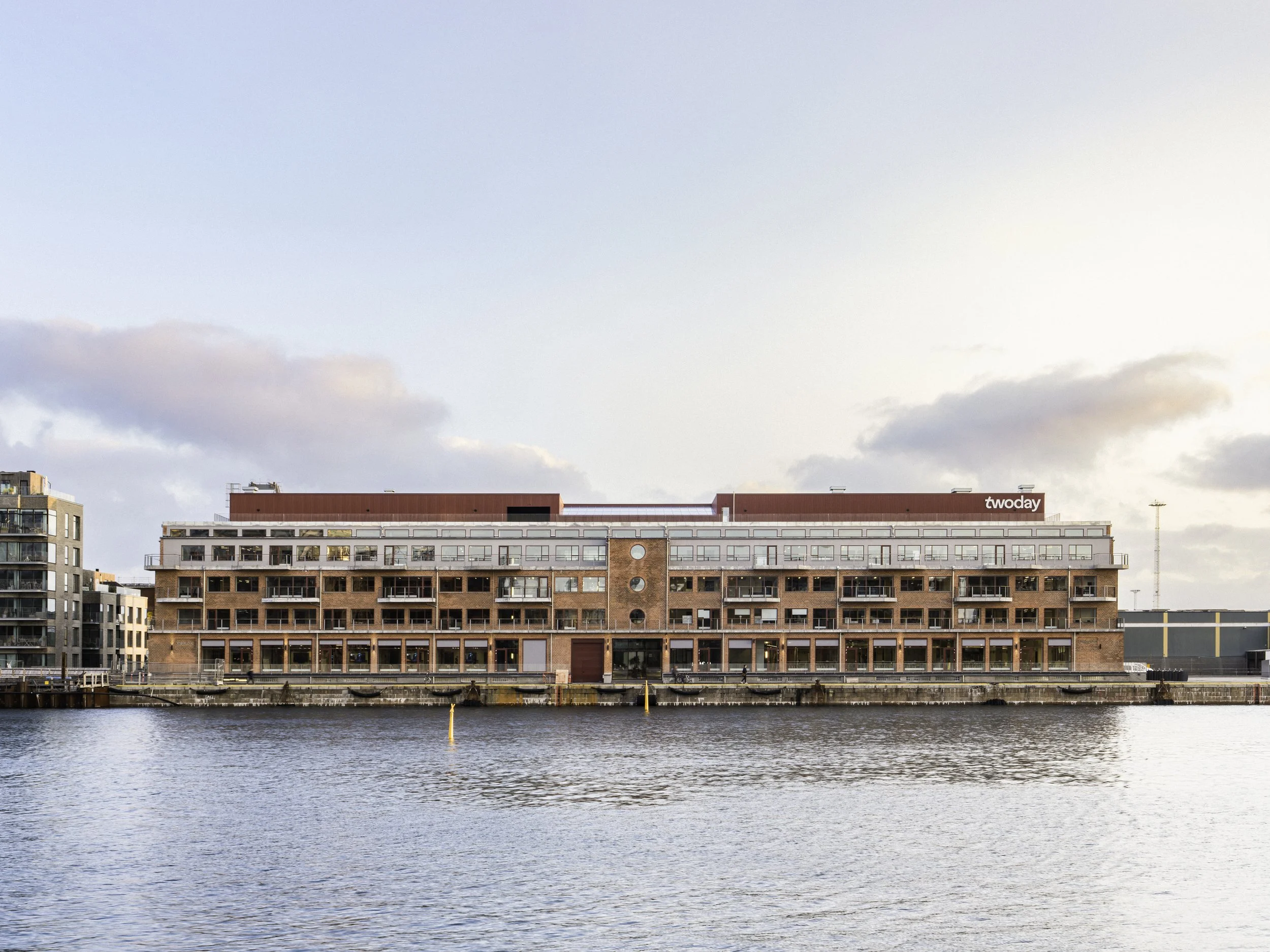 Indvendigt skaber rå beton, fritlagte murstensvægge og naturlige materialer et inspirerende miljø. En centralt placeret spiraltrappe forbinder etagerne. Store, runde vinduer mod havnefronten åbner bygningen op mod omgivelserne og styrker forbindelsen til havnen.